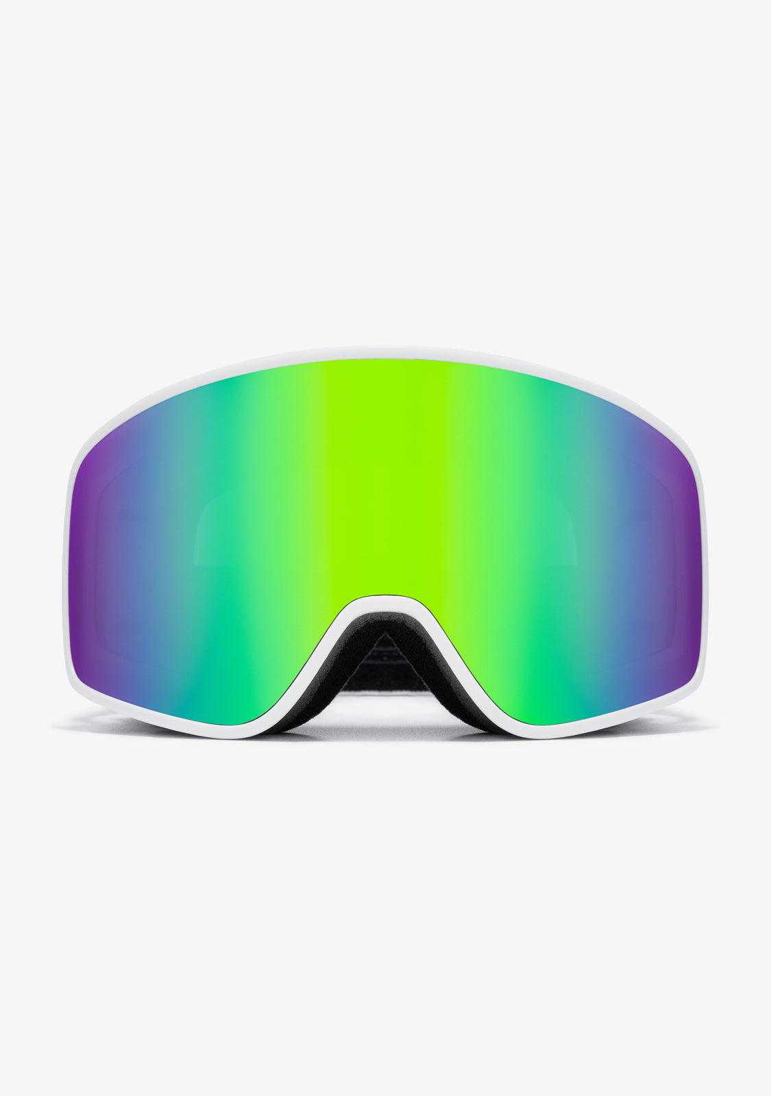Este modelo inspirado en las cumbres cuenta con unas lentes de policarbonato efecto espejo sin límites ni marco. Presenta un acabado verde y blanco con nuestro distintivo emblema en el lateral de su banda elástica blanca. El ancho uniforme de lente es de 179.5 mm.