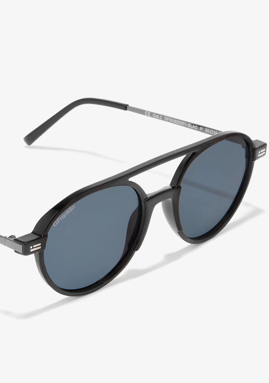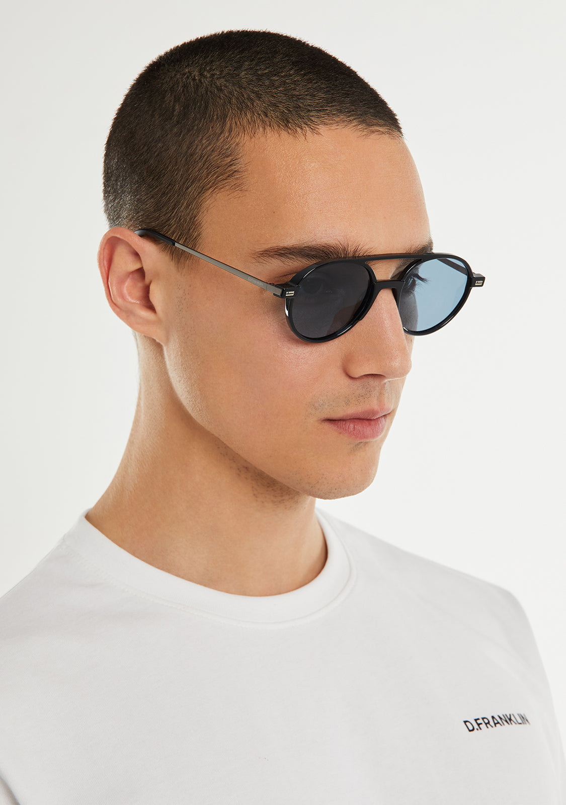 Nuestro modelo Chuck en tono azul cuenta con los detalles distintivos de D.Franklin, el logo grabado en las patillas y emblema en la lente. Su ancho de lente es de 50 mm y su frontal de 140 mm. Las varillas laterales tienen una longitud de 145 mm que favorece a todos los rostros.