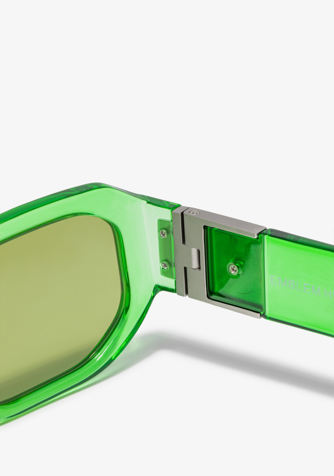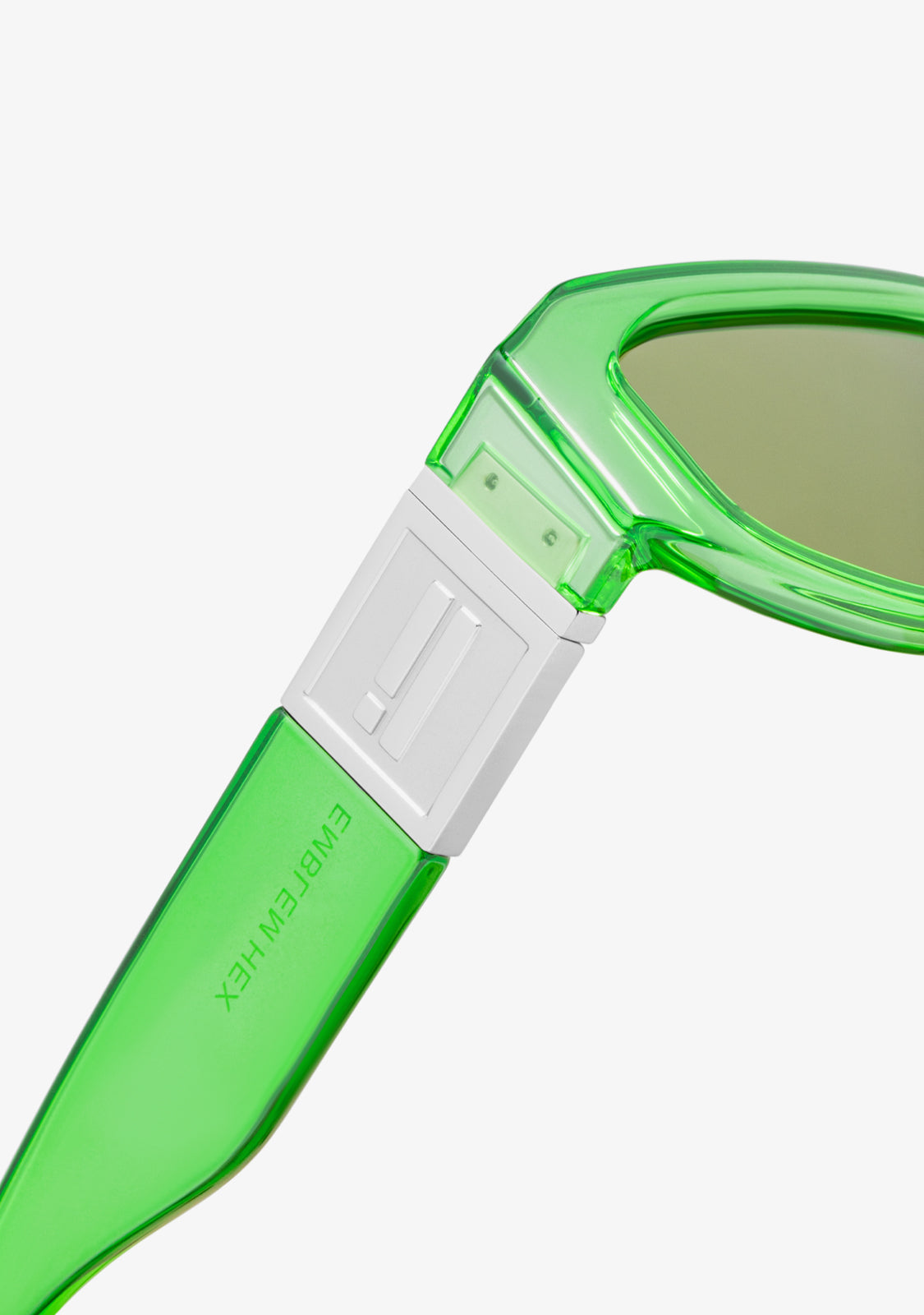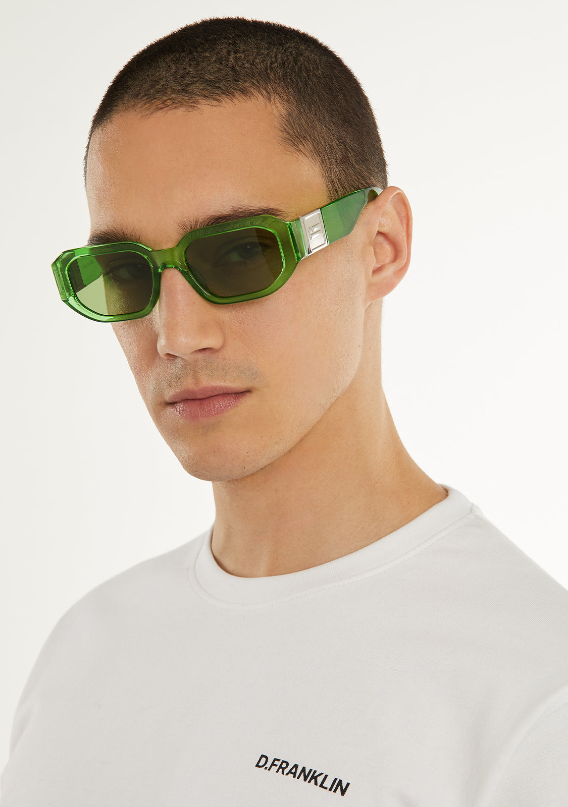 Sus lentes polarizadas en tono verde y su montura a juego resaltan la singularidad de este diseño. Cuenta con nuestra distintiva bandera D.Franklin con un acabado dorado metalizado en ambas patillas. El ancho de lente de 52 mm y el marco frontal de 139 mm quedan unidos mediante una varilla asimétrica de 140 mm.