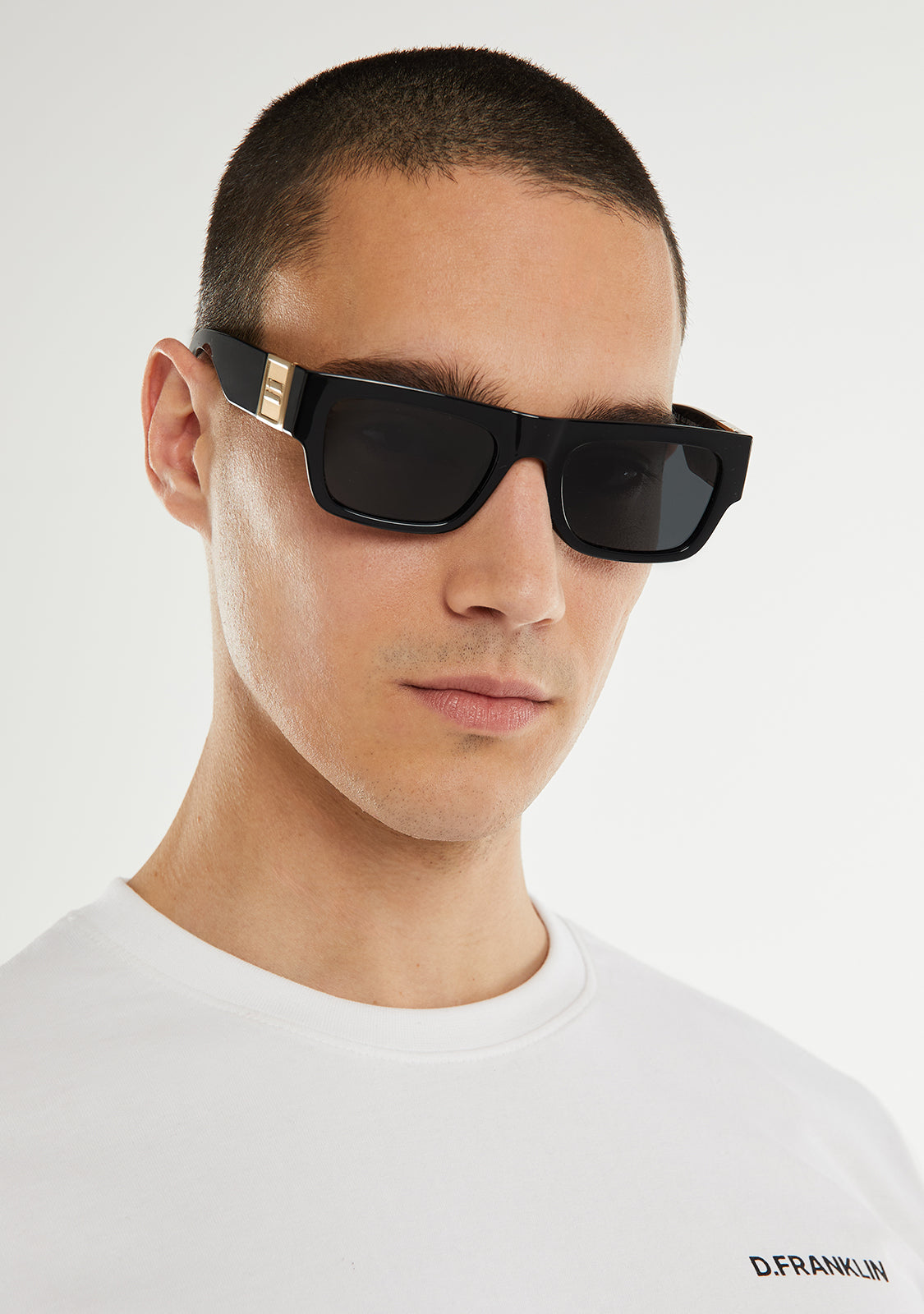 Sus lentes polarizadas ahumadas y su montura oscura resaltan la estética de este diseño. Cuenta con nuestra distintiva bandera D.Franklin con un acabado dorado metalizado en ambas patillas. El ancho de lente de 52 mm y una marco frontal de 141 mm, estas gafas favorecen a la mayoría de los rostros. Las varillas laterales tienen una longitud de 140 mm.