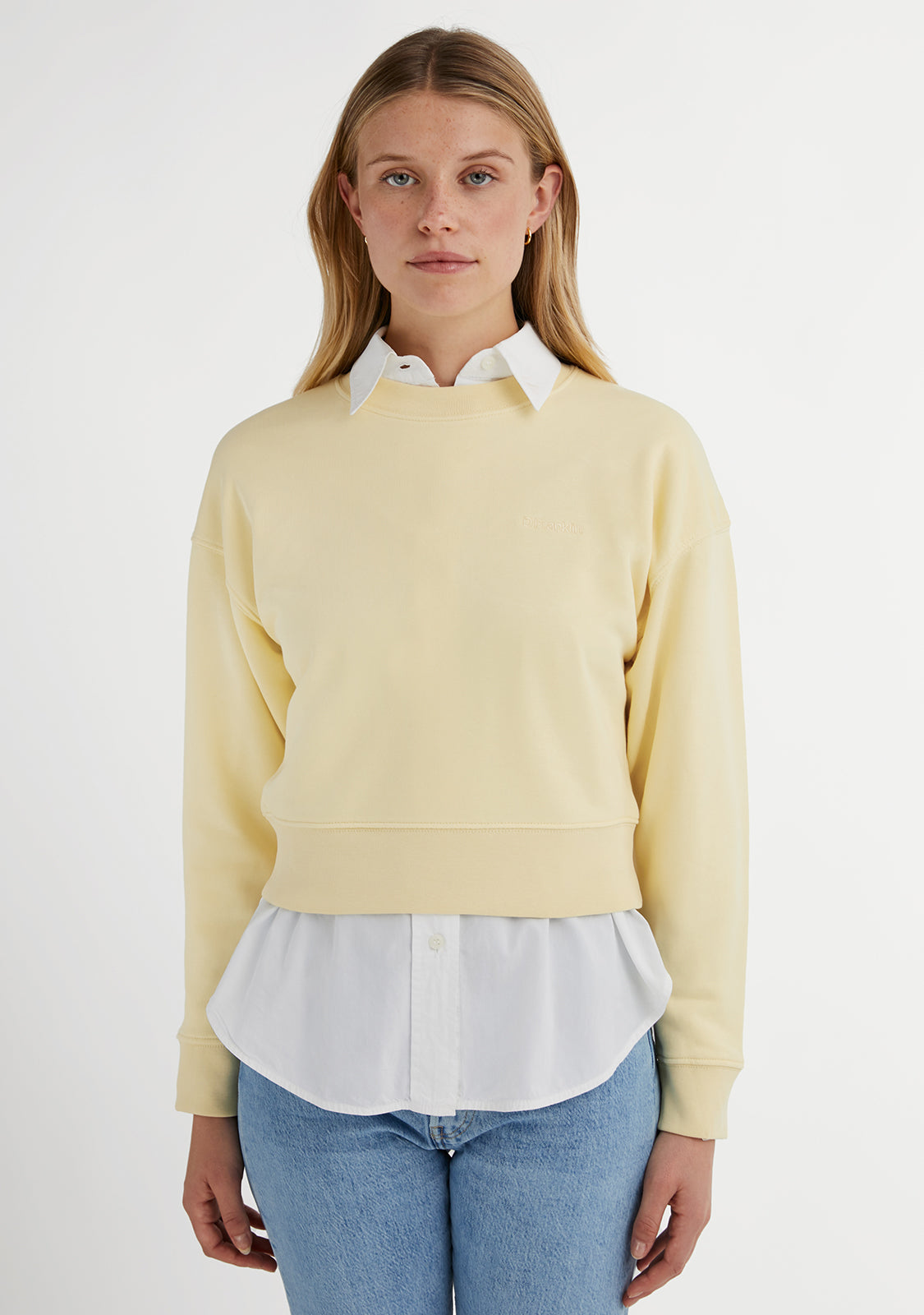 Únete al estido D.Franklin con nuestra última colección de sudaderas. Sencillas y cómodas. Son la combinación perfecta entre los colores más básicos y combinables y la aplicación del logo de la marca. La Embroidery Logo Cropped Crew Neck Sweatshirt / Butter está fabricada con los mejores materiales, lo que le aporta gran transpirabilidad y elasticidad.