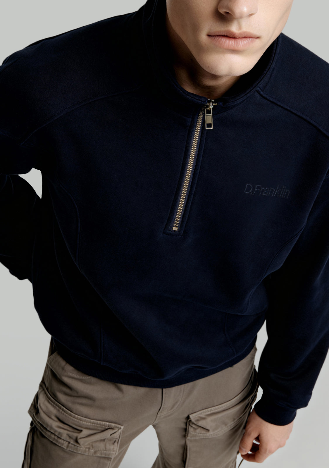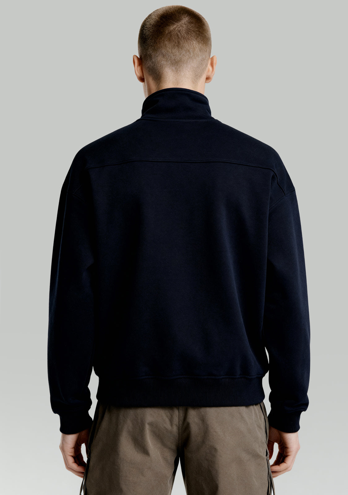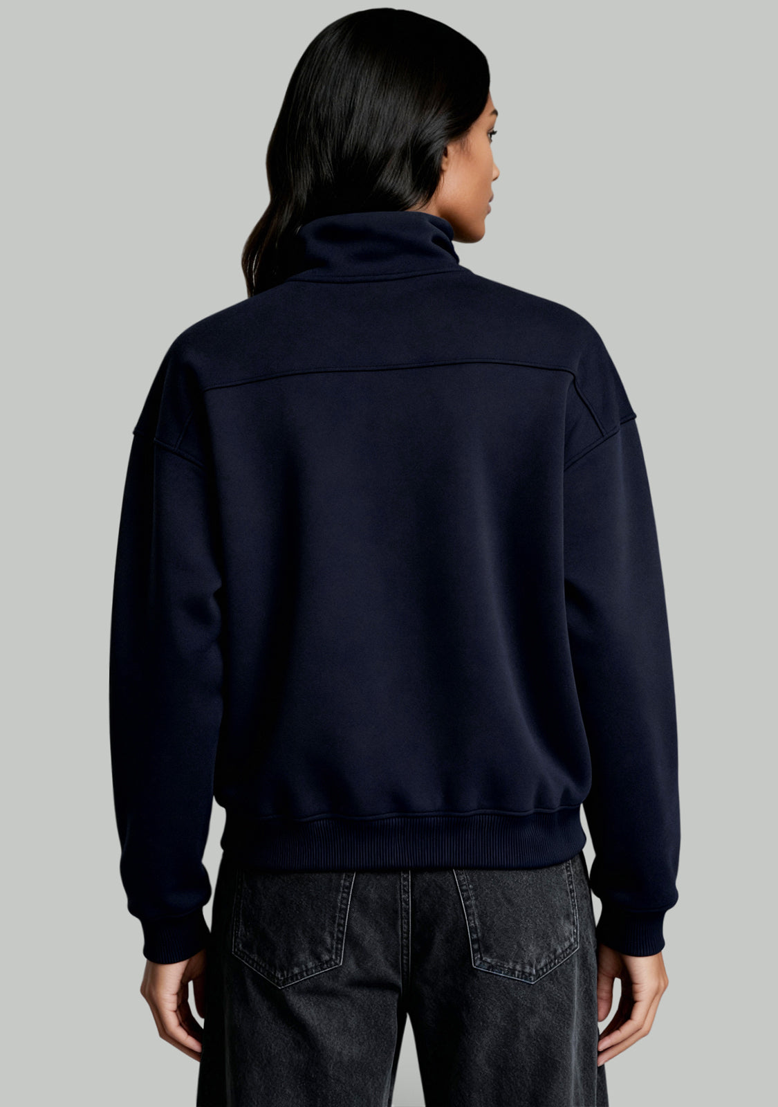 La Half-Zip Sweatshirt Navy es una sudadera unisex que combina comodidad con un diseño moderno. El cuello con media cremallera aporta flexibilidad, mientras que las costuras definidas rompen con la sencillez para un look más dinámico.