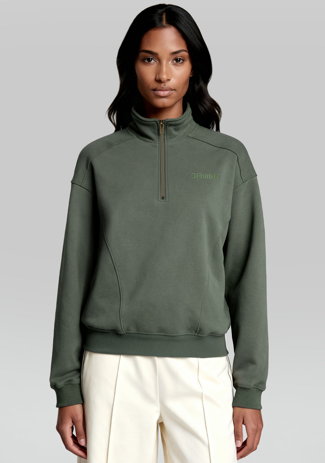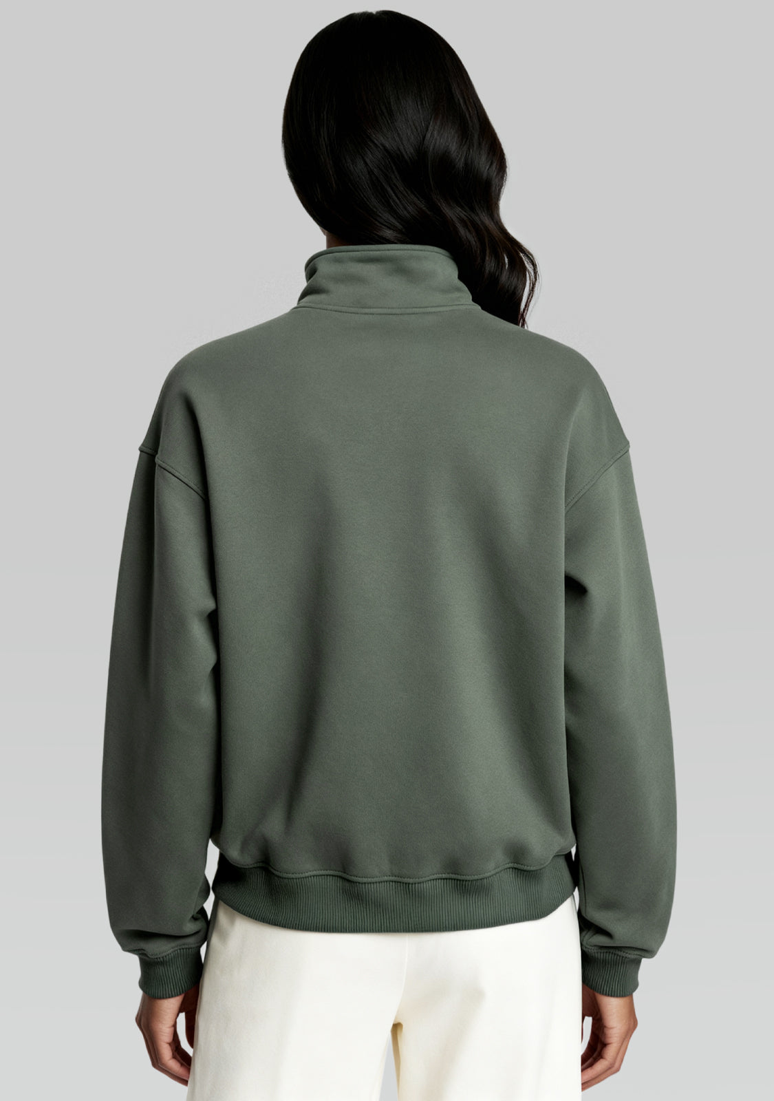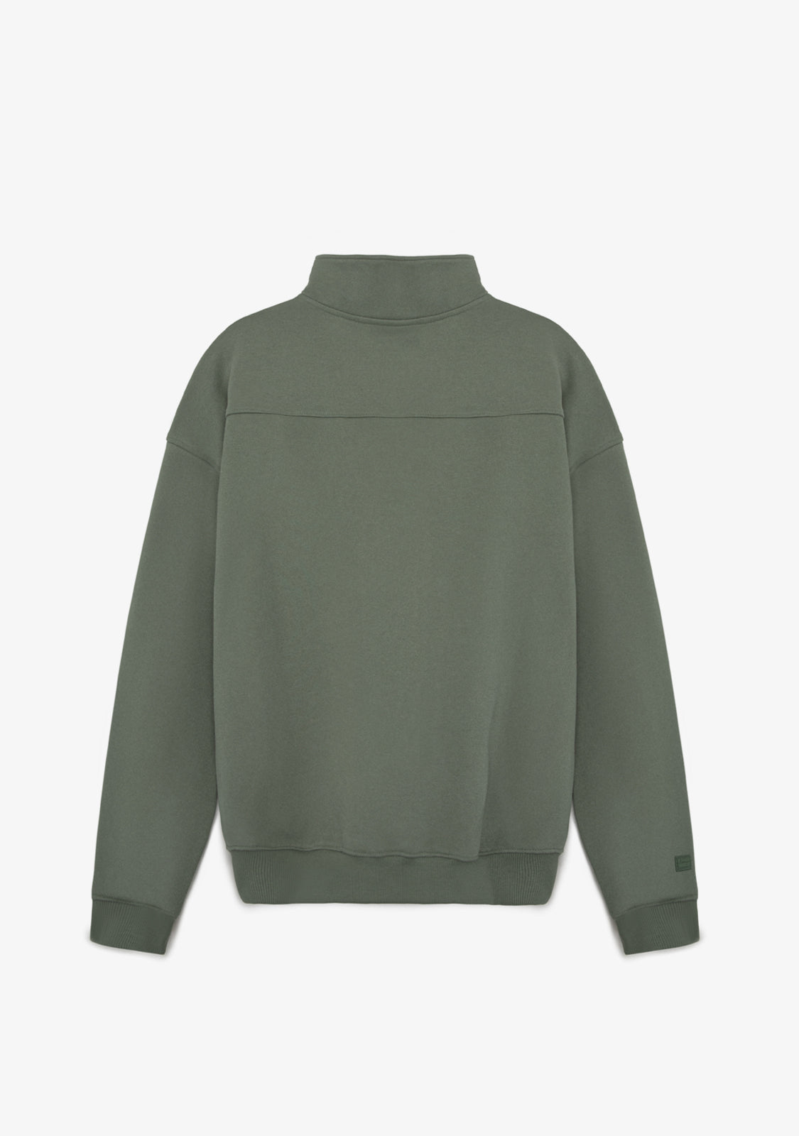 La Half-Zip Sweatshirt Sage Green es una sudadera unisex que combina comodidad con un diseño moderno. El cuello con media cremallera aporta flexibilidad, mientras que las costuras definidas rompen con la sencillez para un look más dinámico.