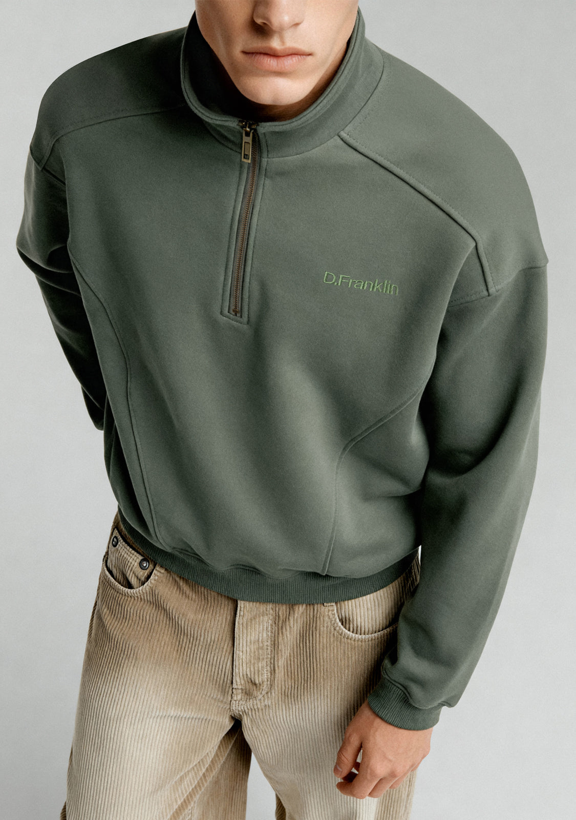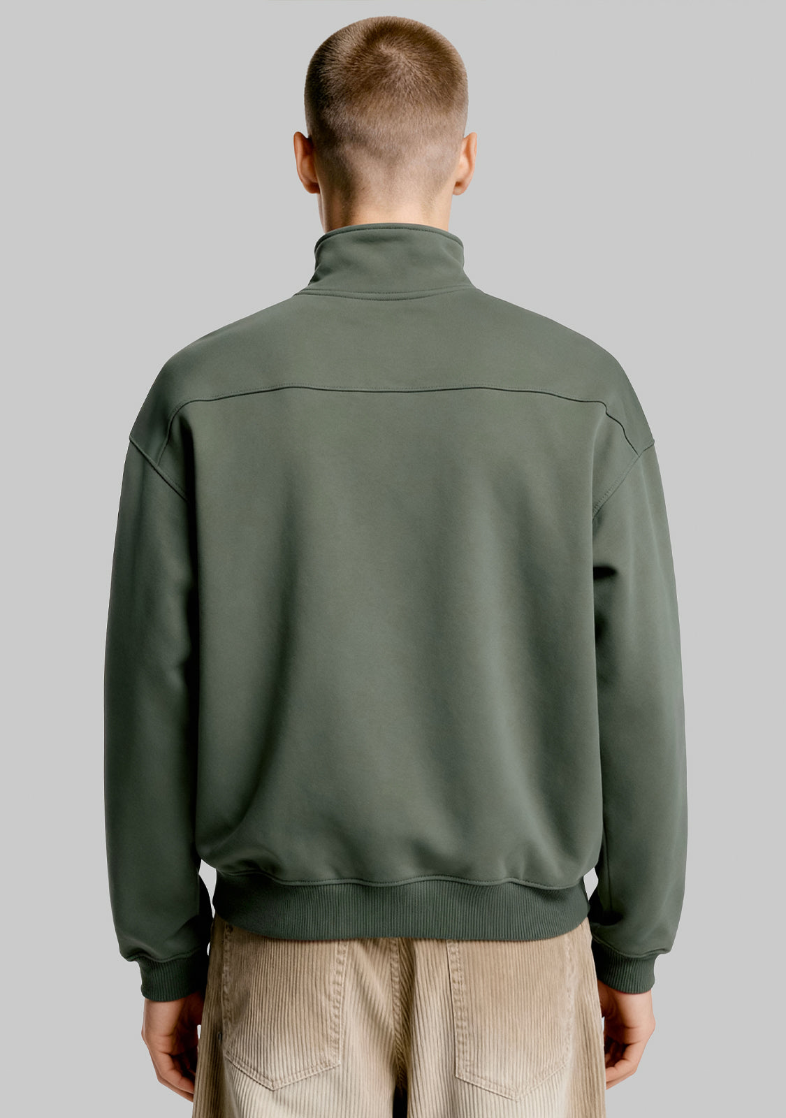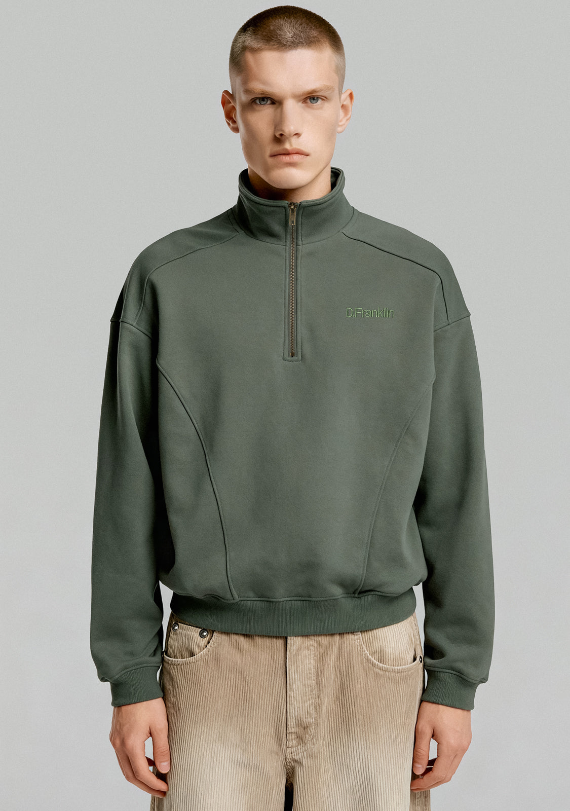 La Half-Zip Sweatshirt Sage Green es una sudadera unisex que combina comodidad con un diseño moderno. El cuello con media cremallera aporta flexibilidad, mientras que las costuras definidas rompen con la sencillez para un look más dinámico.