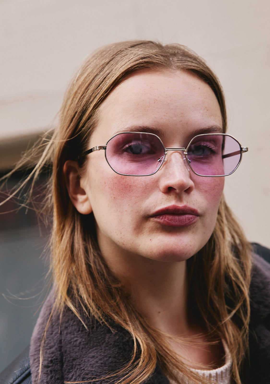 El diseño Square LX presenta un acabado metálico con estética hexagonal. Su montura en tono plateado ha sido diseñada con unas lentes antirreflectantes de acabado lavanda que permiten traspasar la mirada y definir las facciones. Su frontal es de 141 mm y su ancho de lente de 54 mm. Las patillas tienen una longitud de 140 mm y cuentan con nuestros detalles distintivos. Una pieza retro a la vez que minimalista con la que enmarcar cualquier estilismo.