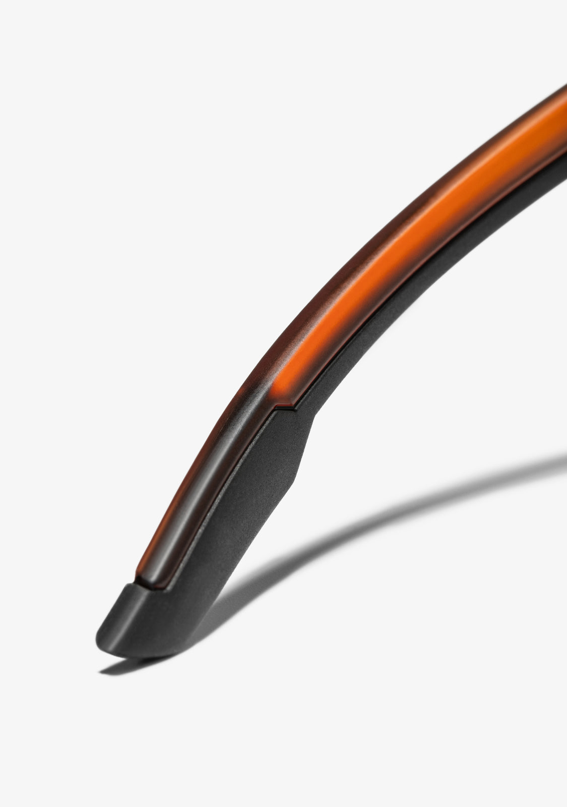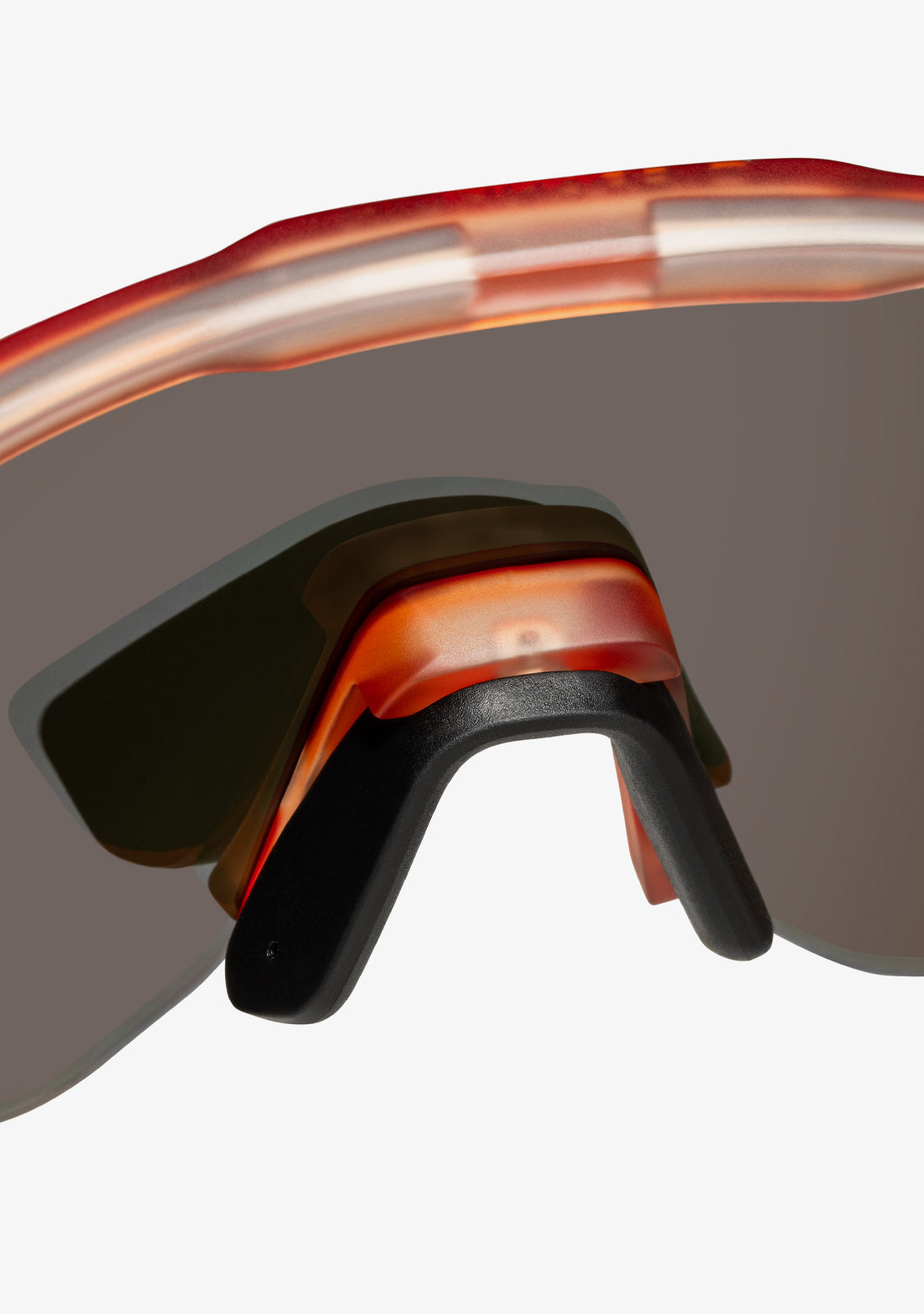 El modelo Hurricane Red se distingue por su acabado rojizo y su armazón aerodinámico. Cuenta con un frente de 142 mm y lentes de 152 mm, diseñadas con precisión para optimizar el flujo de aire y reducir la resistencia al viento. Las varillas de 140 mm muestran nuestro emblema en ambos lados, mientras que las almohadillas de silicón en las puntas y el puente nasal garantizan un agarre firme y cómodo durante cualquier actividad.