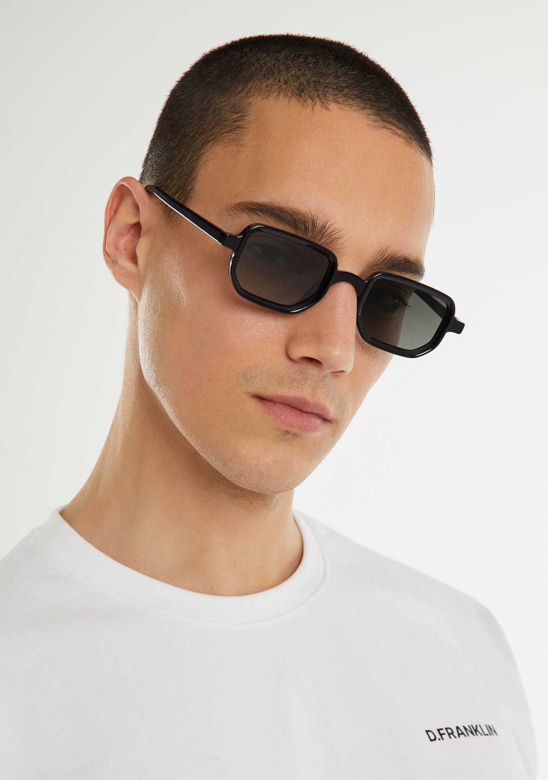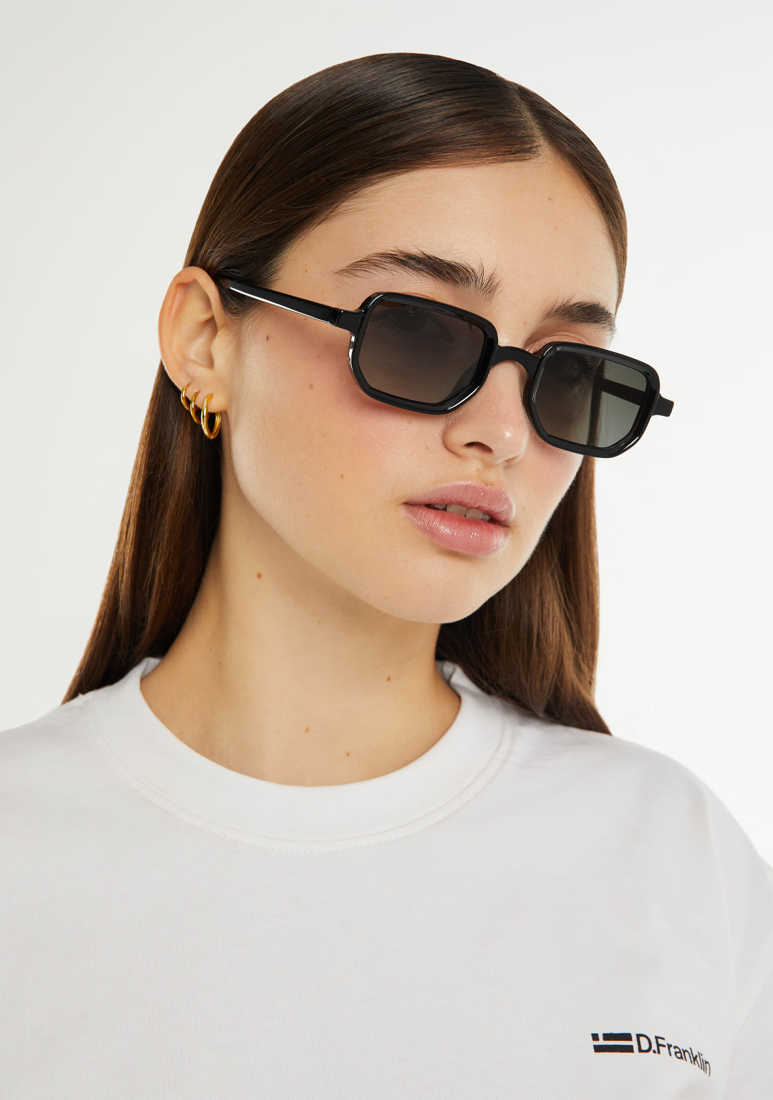 Descubre nuestro modelo Jiggy en tono negro. Esta silueta de inspiración retro cuenta con los detalles distintivos de D.Franklin: el logo grabado en las patillas y emblema en la lente. Su ancho de lente es de 47 mm y su frontal de 143 mm. Las varillas laterales tienen una longitud de 145 mm.