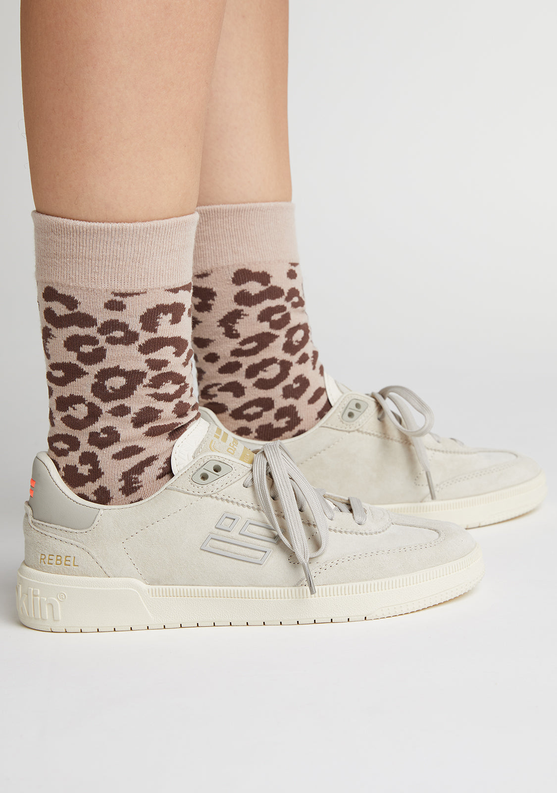 Los Calcetines Leopardo Arena de D.Franklin combinan un diseño de leopardo con un suave tono arena, añadiendo un toque moderno y elegante a cualquier outfit. Estos calcetines de media caña están diseñados para proporcionar comodidad y un ajuste cómodo durante todo el día. El logotipo de D. Franklin en la suela completa el diseño con un detalle distintivo. Fabricados con una mezcla de algodón, nailon y elastano, ofrecen la durabilidad y la flexibilidad que necesitas en tus calcetines de diario.