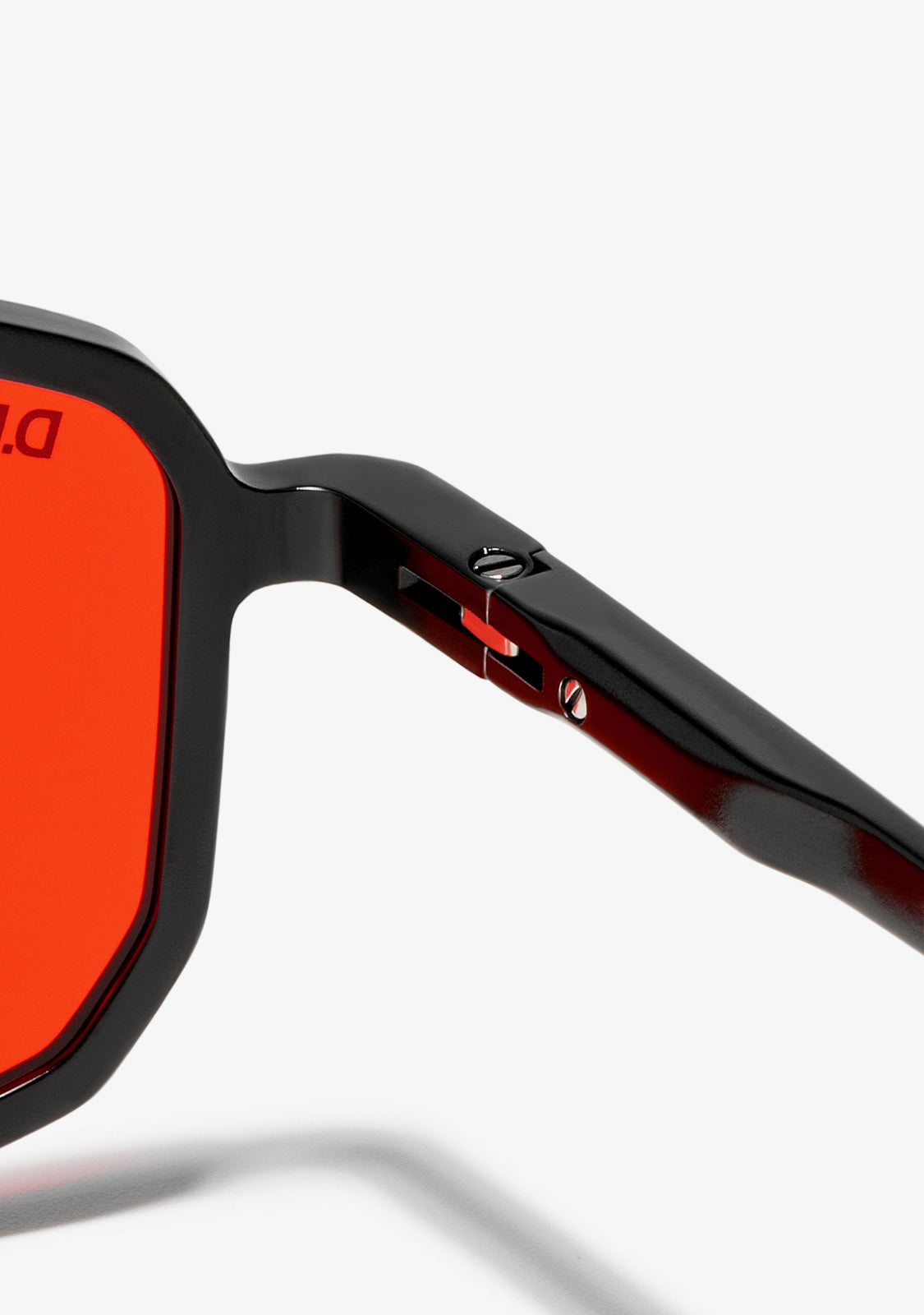 Gracias a su fabricación en aluminio, estas gafas son ultra ligeras. Cuentan con lentes polarizadas en tono rojo y un marco negro mate que afianza su característica estética. El diseño presenta nuestro emblema en la lente derecha y con logo metalizado en el lateral de las patillas. Cuenta con una montura frontal de 143 mm y un ancho de lente de 52 mm, que se adapta a la mayoría de rostros. Las varillas tienen una longitud de 138 mm.