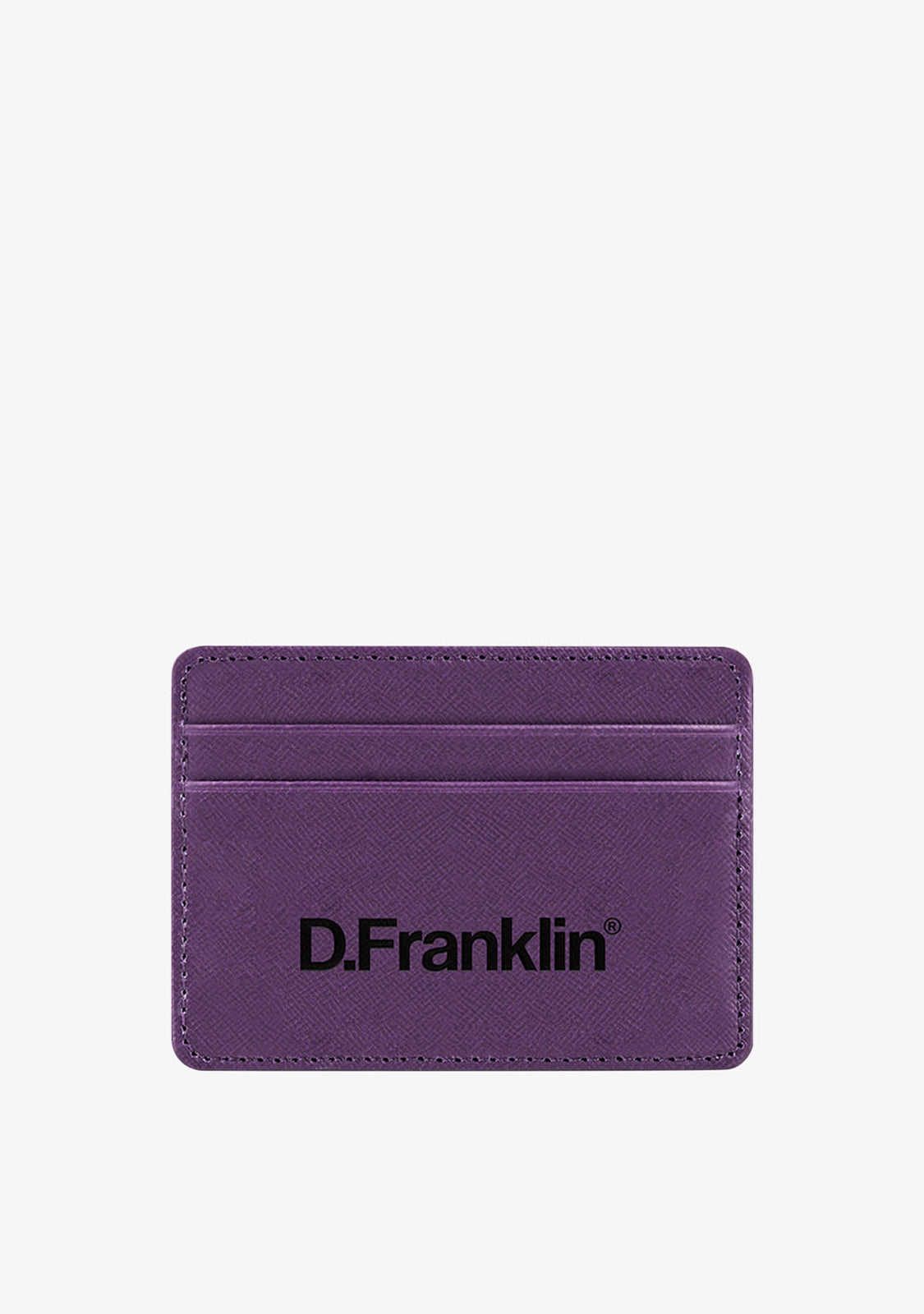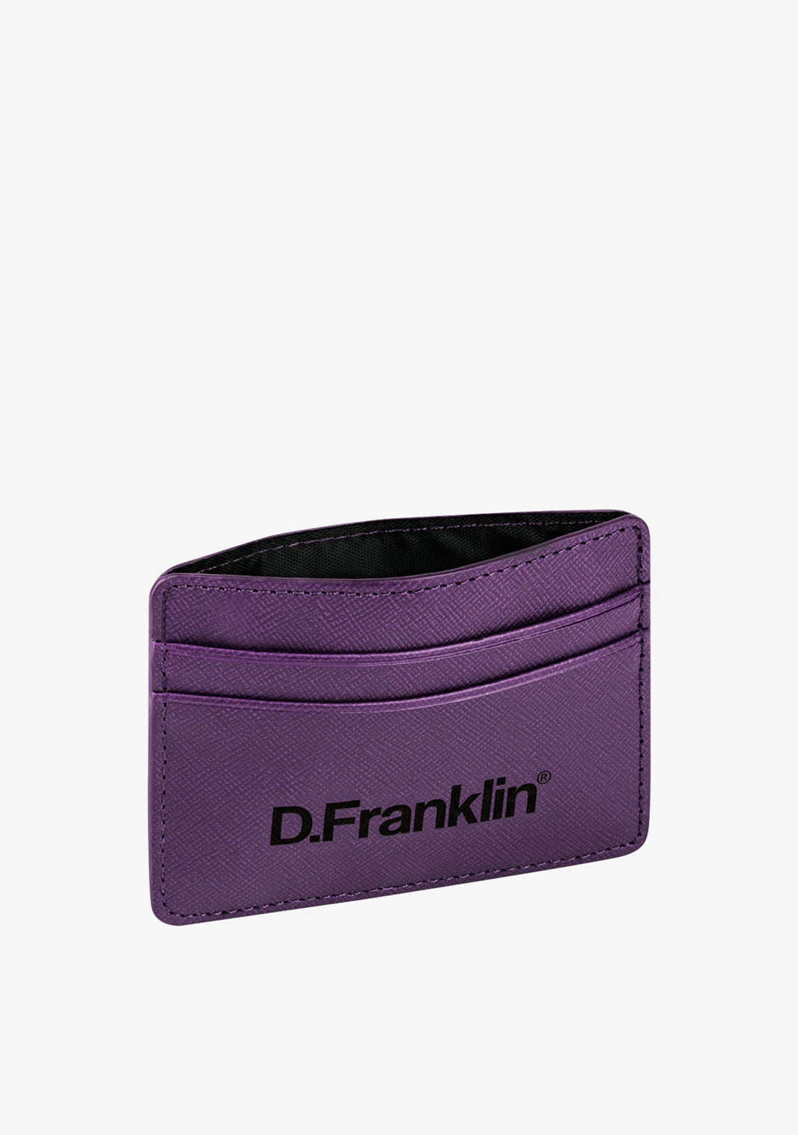 Tarjetero de piel ecológica morada con el logo grabado de D.Franklin.
