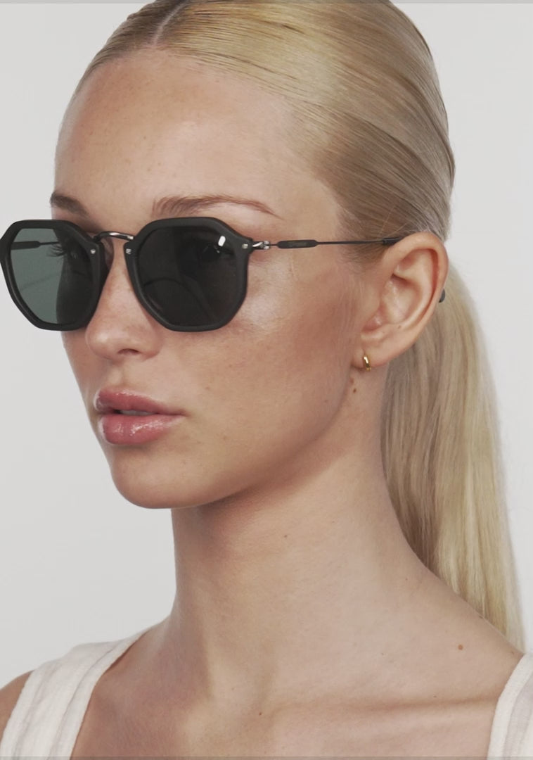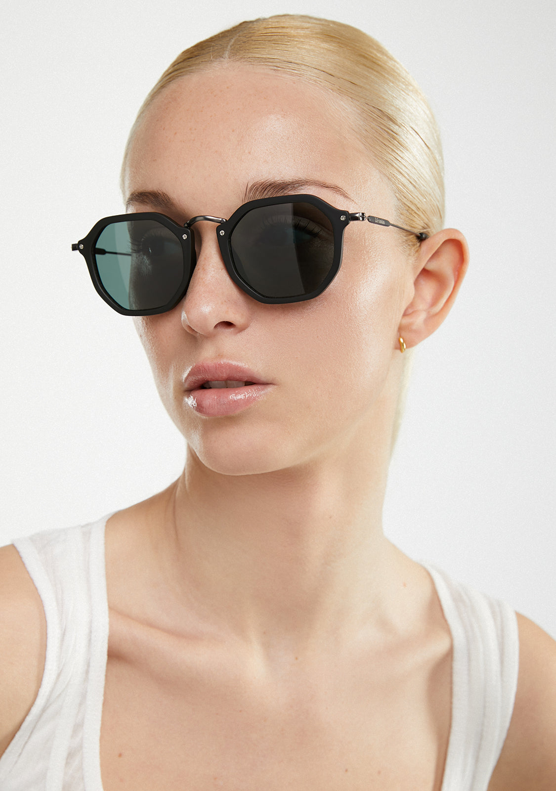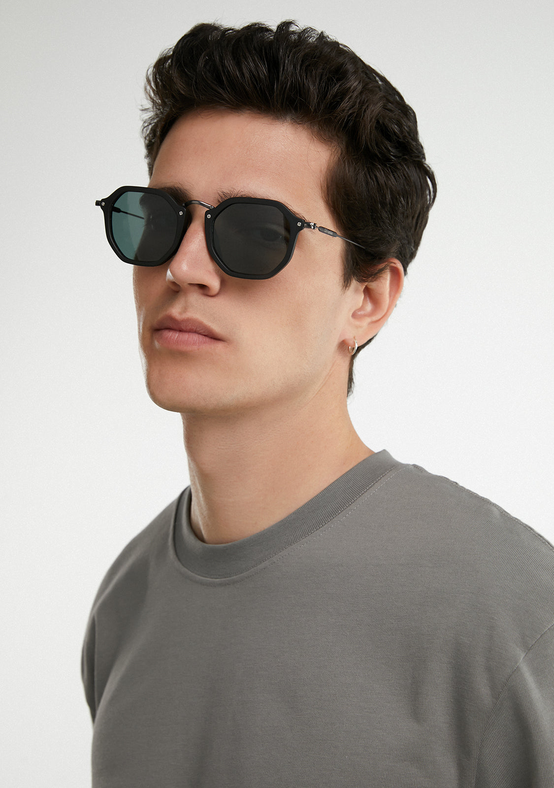 Sus lentes de policarbonato y su contorno octogonal negro mate refuerzan el icónico estilo del modelo. Cuenta con nuestros detalles característicos D.Franklin: el logo grabado en ambas patillas metálicas y nuestro emblema en la lente derecha. Con un ancho de lente de 51 mm y una montura frontal de 148 mm, estas lentes realzan las facciones de cualquier rostro. Las varillas laterales de acero inoxidable tienen una longitud de 145 mm.