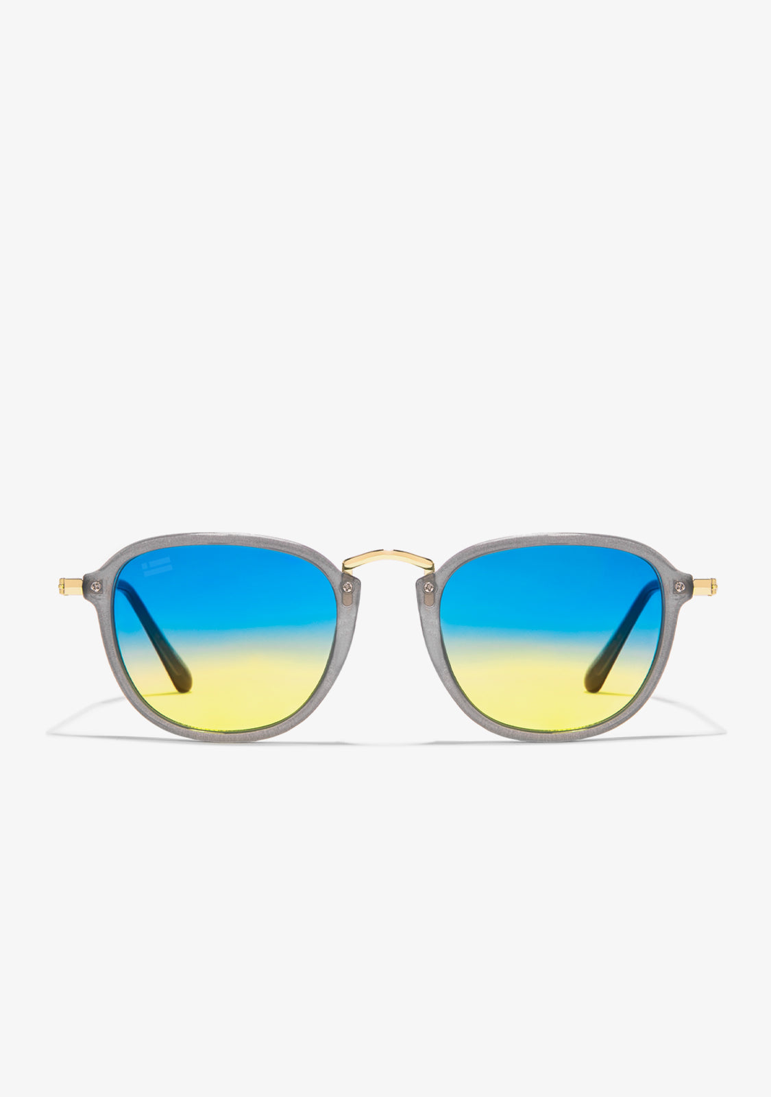 Sus lentes de policarbonato presentan un tono azul ahumado sobre una silueta dorada de estructura cuadrada. Cuenta con los detalles distintivos de nuestra marca: el logo grabado en ambas varillas metálicas y nuestro emblema en la lente derecha. Con un ancho de lente de 51 mm y una montura frontal de 147 mm, estas gafas realzan las facciones de cualquier rostro. Las varillas laterales son de acero inoxidable y tienen una longitud de 145 mm.
