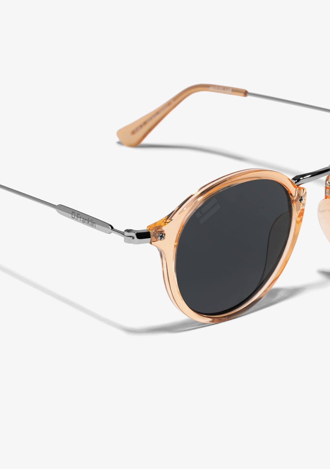 Sus lentes redondeadas teñidas en gris y su montura en ámbar refuerzan la estética setentera de este modelo. Cuenta con nuestros detalles distintivos D.Franklin: el logo grabado en ambas varillas metálicas y nuestro emblema en la lente derecha. Con un ancho de lente de 49 mm y una montura con ancho frontal de 148 mm, estas gafas favorecen a la mayoría de los rostros. Las varillas laterales tienen una longitud de 145 mm.