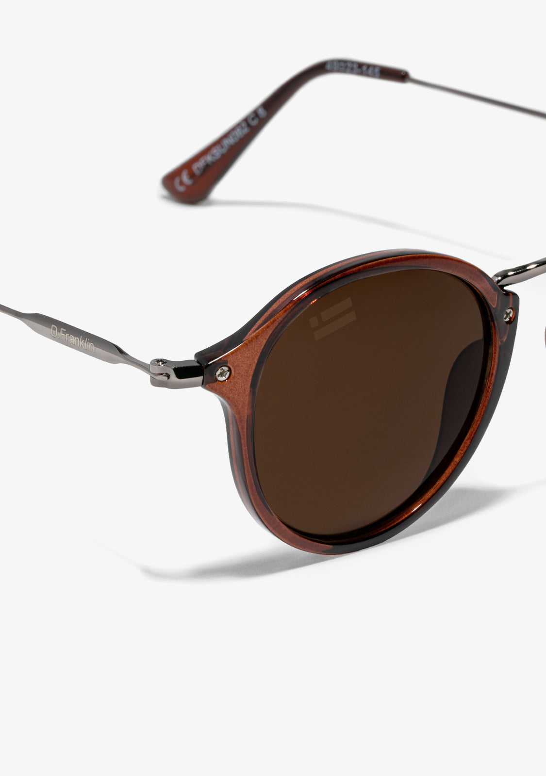 Sus lentes redondeadas teñidas en marrón y su montura en el mismo color refuerzan la estética setentera de este modelo. Cuenta con nuestros detalles distintivos D.Franklin: el logo grabado en ambas varillas metálicas y nuestro emblema en la lente derecha. Con un ancho de lente de 49 mm y una montura con ancho frontal de 148 mm, estas gafas favorecen a la mayoría de los rostros. Las varillas laterales tienen una longitud de 145 mm.