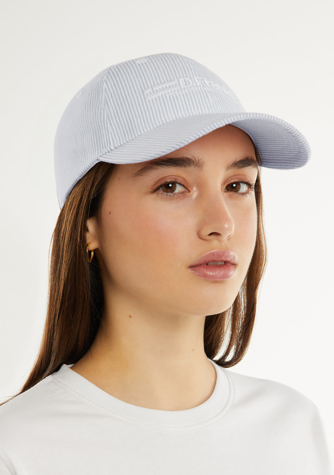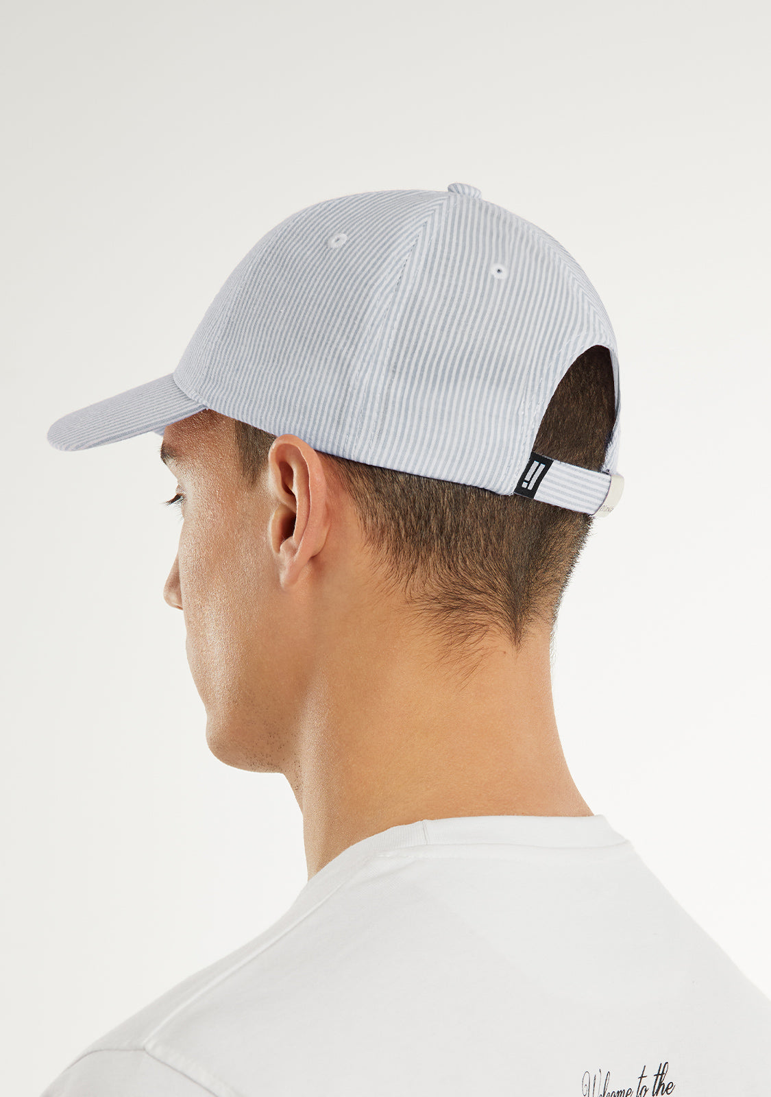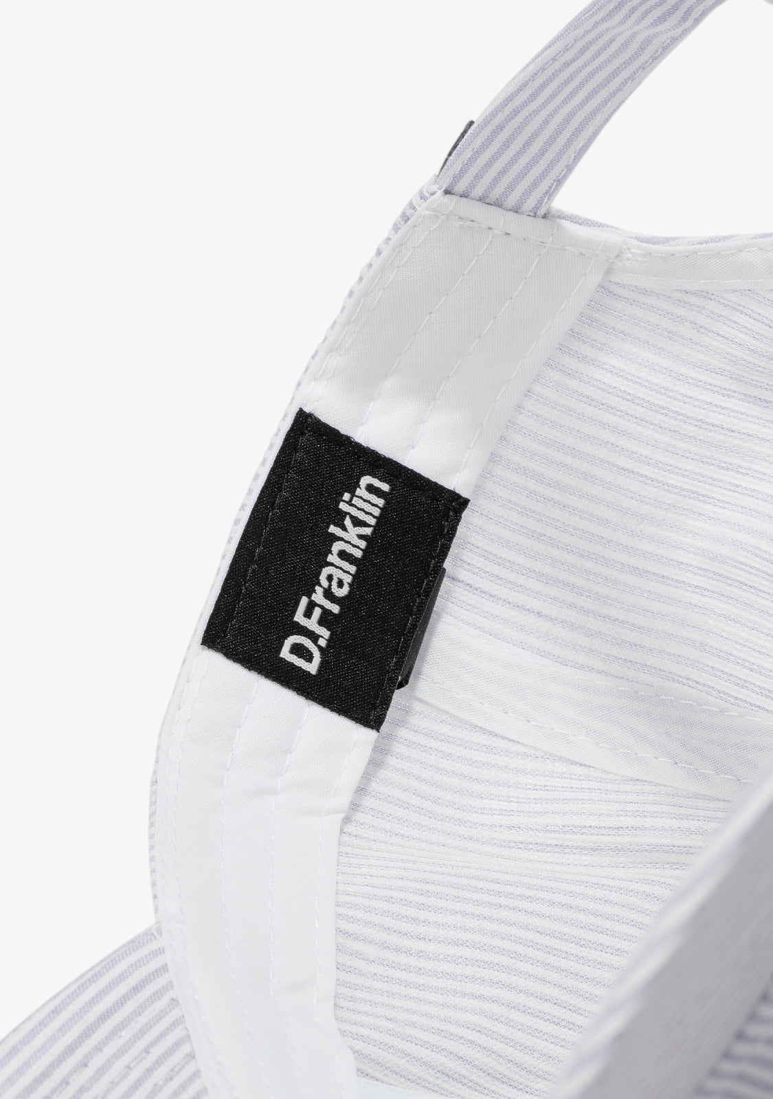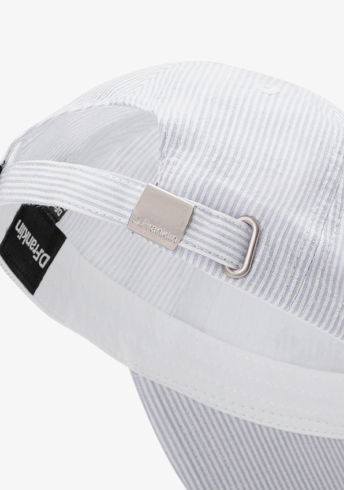 Gorra D.Franklin de rayas en color azul y blanco con detalle de pespuntes en el mismo color. Inspirada en la tendencia Old Money.