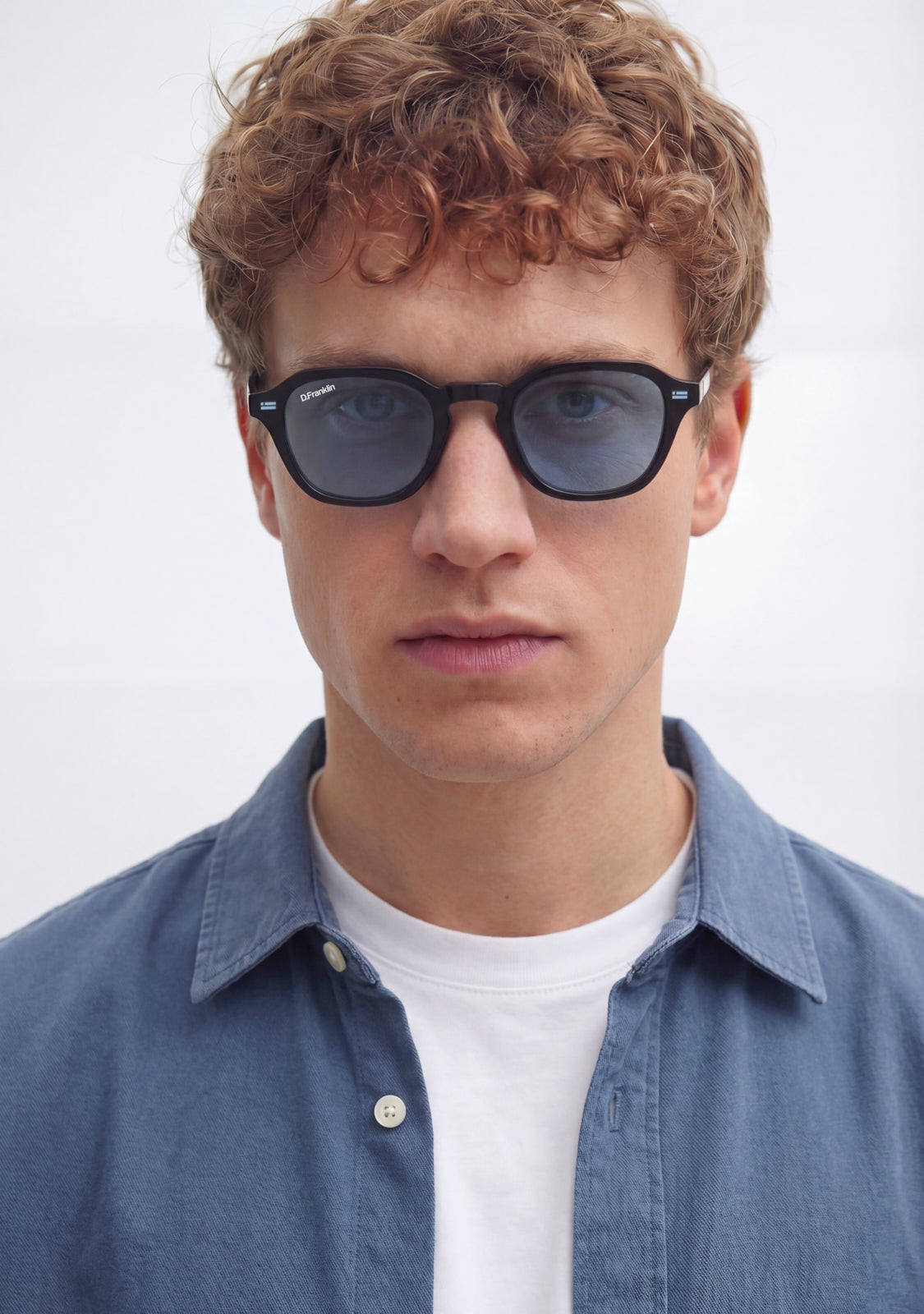 Nuestro modelo Ultra Light S Square con acabado en negro cuenta con nuestros detalles distintivos de D.Franklin: logo grabado en ambas varillas y nuestro emblema en la lente derecha. Su ancho de lente es de 46 mm y su frontal de 140.5 mm. Las varillas laterales tienen una longitud de 145 mm.